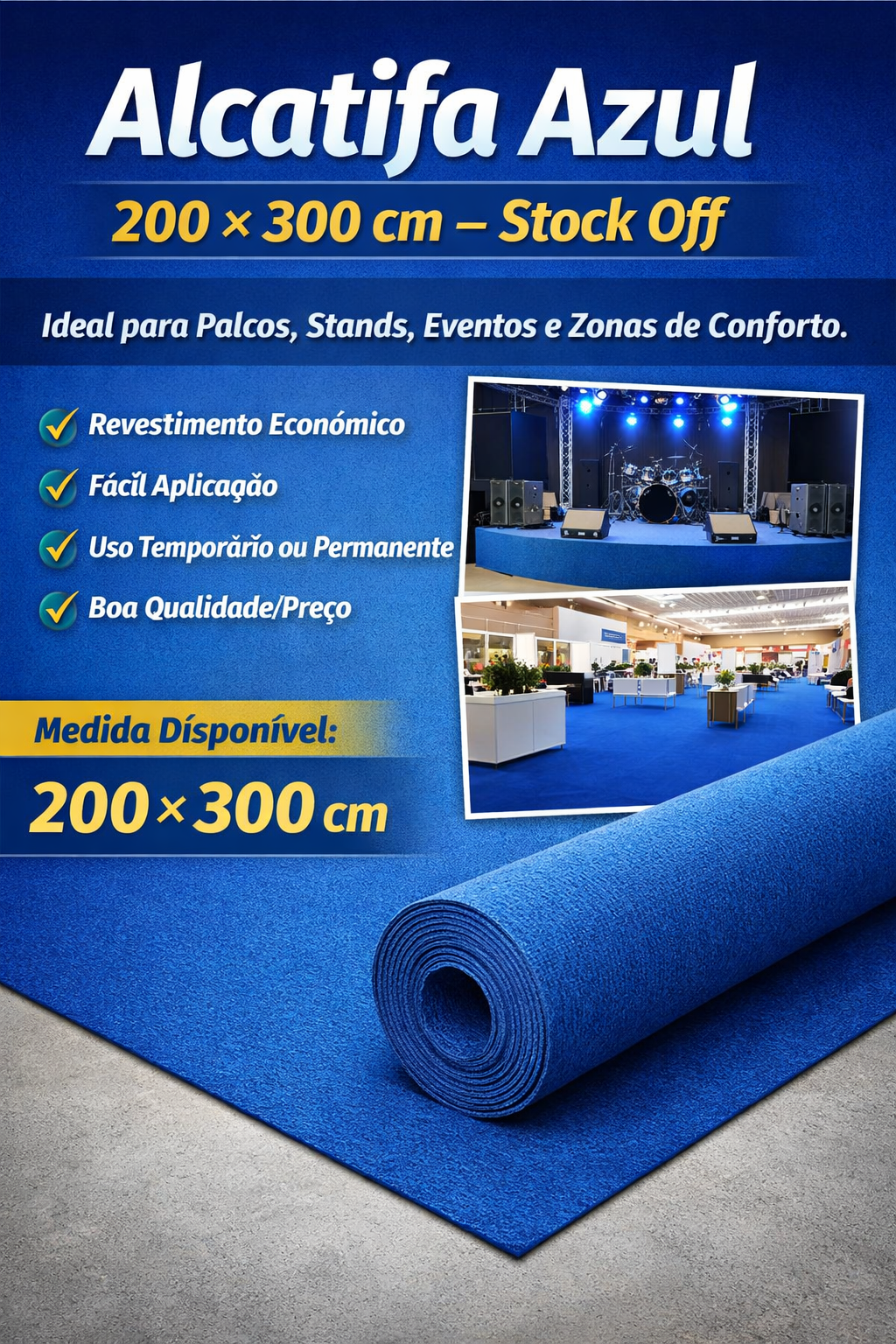 A alcatifa azul de stock off é uma solução prática e económica para revestimento de pavimentos em diferentes contextos, como palcos, stands de feiras, eventos, exposições ou zonas onde se pretende maior conforto e estética.